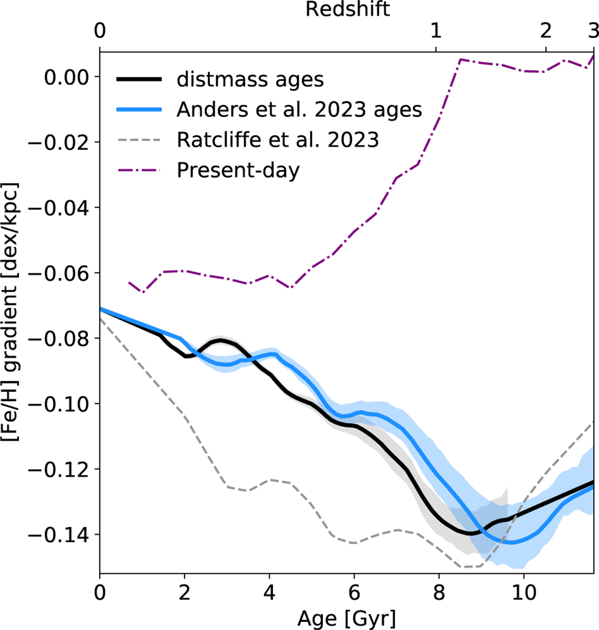 Recent works identified a way to recover the time evolution of a galaxy’s disk metallicity gradient from the shape of its age–metallicity relation. However, the success of the method is dependent on how the width of the star-forming region evolves over time, which in turn is dependent on a galaxy’s present-day bar strength. In this paper, we account for the time variation in the width of the star-forming region when deriving the interstellar medium (ISM) metallicity gradient evolution over time ($\nabla\lbrack Fe/H \rbrack(\tau)$), which provides more realistic birth radii estimates of Milky Way (MW) disk stars. Using MW/Andromeda analogues from the TNG50 simulation, we quantified the disk growth of newly born stars as a function of present-day bar strength to provide a correction that improves recovery of $ \nabla \lbrack Fe/H\rbrack (\tau) $. In TNG50, we find that our correction reduces the median absolute error in recovering $\nabla \lbrack Fe/H\rbrack (\tau)$ by over 30%. To confirm its universality, we test our correction on two galaxies from NIHAO-UHD and find the median absolute error is over 3 times smaller even in the presence of observational uncertainties for the barred, MW-like galaxy. Applying our correction to APOGEE DR17 red giant MW disk stars suggests the effects of merger events on $\nabla \lbrack Fe/H\rbrack (\tau)$ are less significant than originally found, and the corresponding estimated birth radii expose epochs when different migration mechanisms dominated. Our correction to account for the growth of the star-forming region in the disk allows for better recovery of the evolution of the MW disk’s ISM metallicity gradient and, thus, more meaningful stellar birth radii estimates. With our results, we are able to suggest the evolution of not only the ISM gradient, but also the total stellar disk radial metallicity gradient, providing key constraints to select MW analogues across redshift.